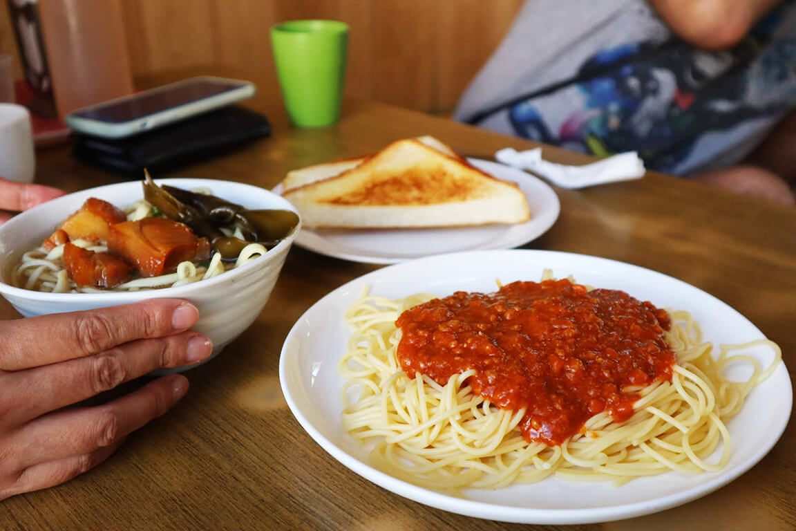 宮里そばでは、沖縄そば以外のメニューも人気があるようです。スパゲッティ(500円)なんとトースト付き、周りを見渡すと、各テーブルで1つは注文しているほど。ほかには、昔ながらのカレーライス(400円)もあります。