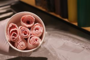 ロールアイスとは、もともとはその名の通り冷たいコールドプレートの上にアイスをのばして、ヘラでくるくるっと丸めていきフルーツやソースなどをトッピングした見た目も可愛い、新感覚のスィーツですね。
