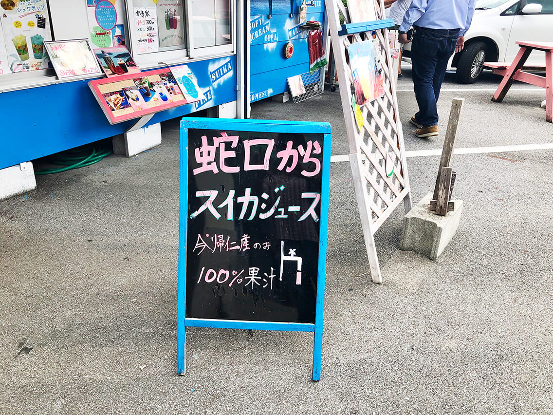 子供から大人まで、ワクワクする夢のような蛇口からスイカジュースは、今帰仁村の橋の駅リカリカワルミの駐車場に「スイーツパーラーワルミNOW」はあります。