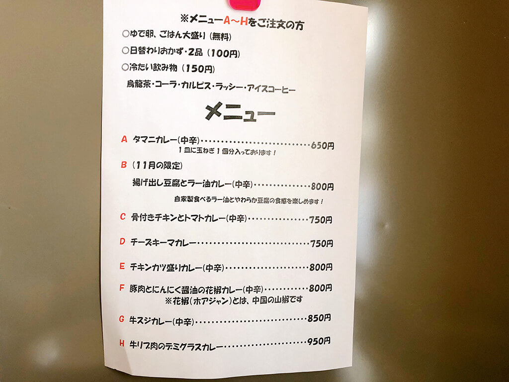 「カレーのタマニ」のメニューは?
