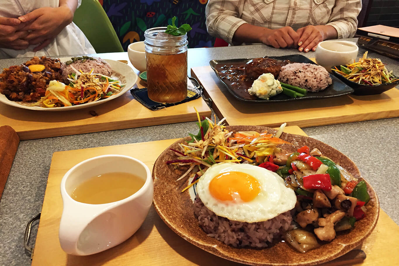 左上は、チリコンカンライス、右上は、煮込みハンバーグ、下はガパオライスをそれぞれ注文。友人と少しづつシェアしながらいただきました。どれを食べても間違いない美味しさ!