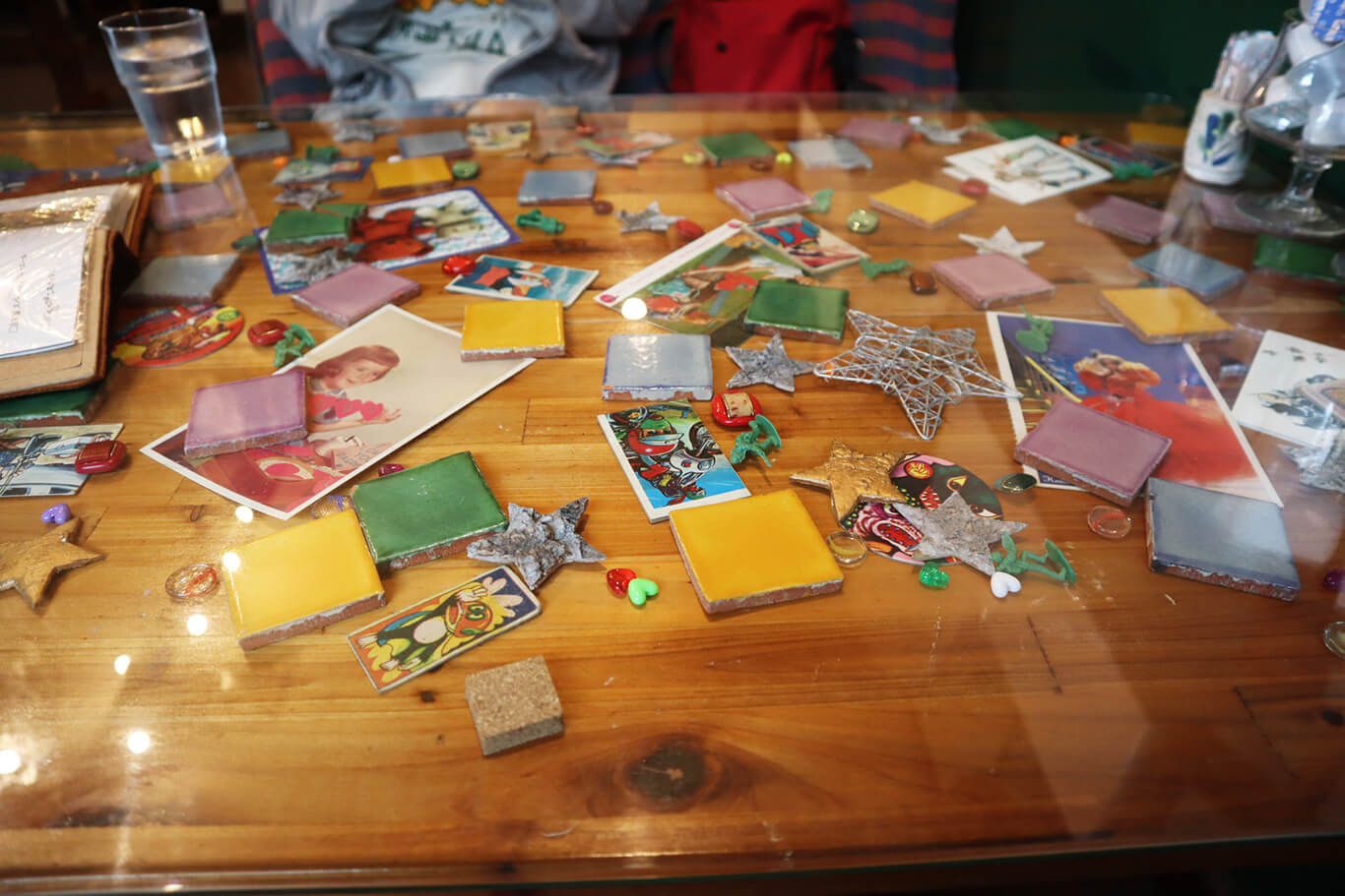 店内は種類の違うテーブルや椅子が並んでいました。ひときわ目をひいた、ガラステーブルへ座りました。メンコやカラフルなタイルや星型のオブジェなどが飾られていて、まるでおもちゃ箱のようでした。