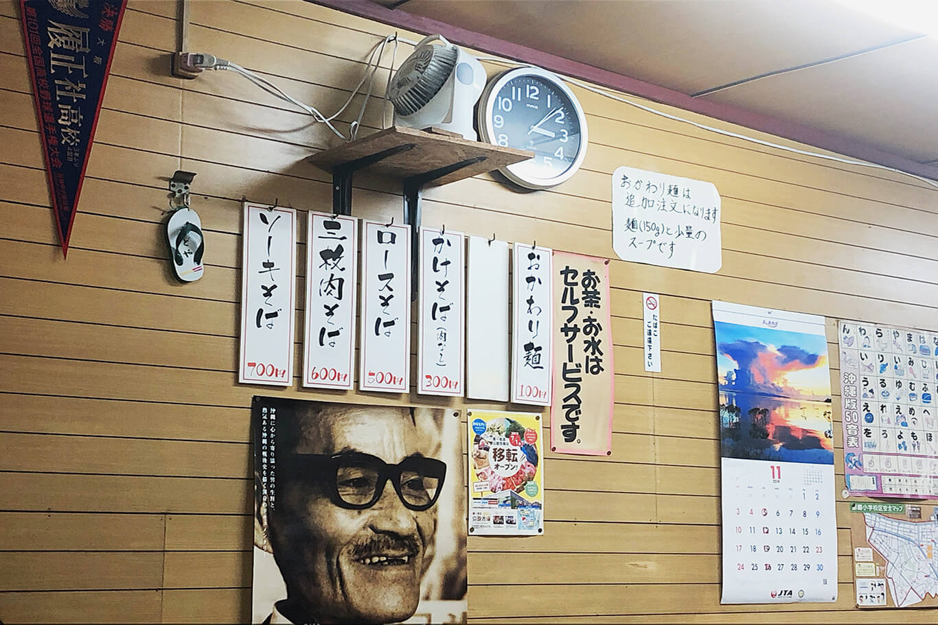 かけそば、ソーキそば、三枚肉そば、ロースそばの4種類。かけそばは肉なしで300円とかなりリーズナブルなお値段です。食べ盛りの学生向けには、100円でおかわり麺の提供もあります。
