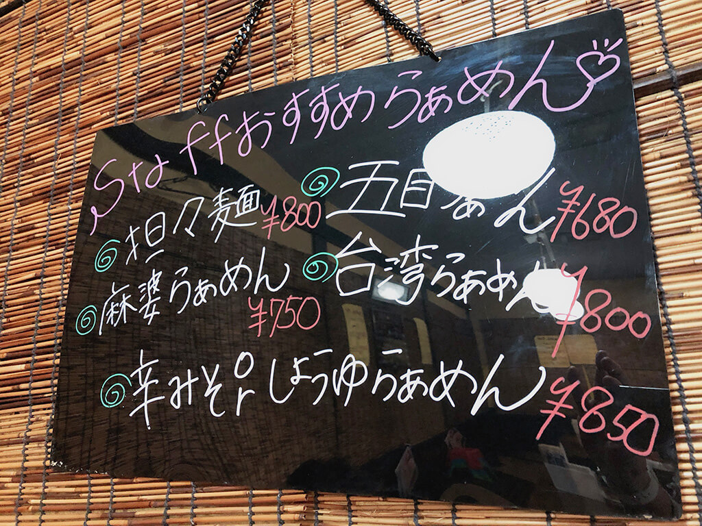 黒板にある、スタッフのおすすめ五目ラーメン。野菜にお肉にキクラゲたっぷりで大満足です。途中で酢を入れて味変も楽しみました。価格は680円!